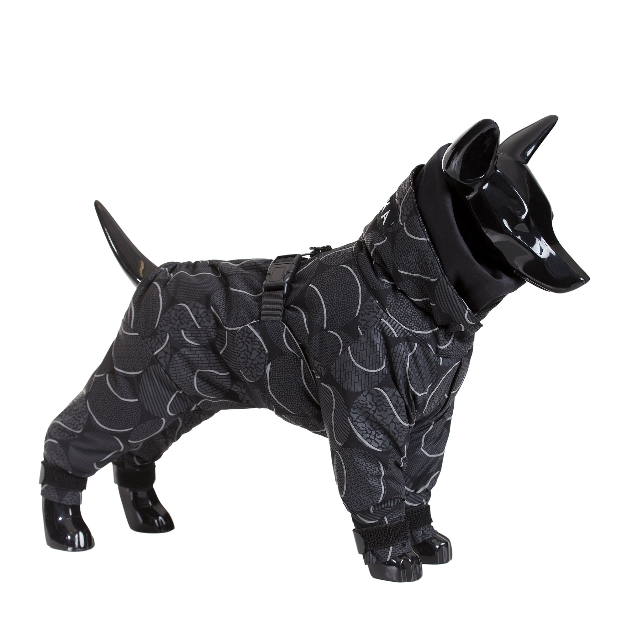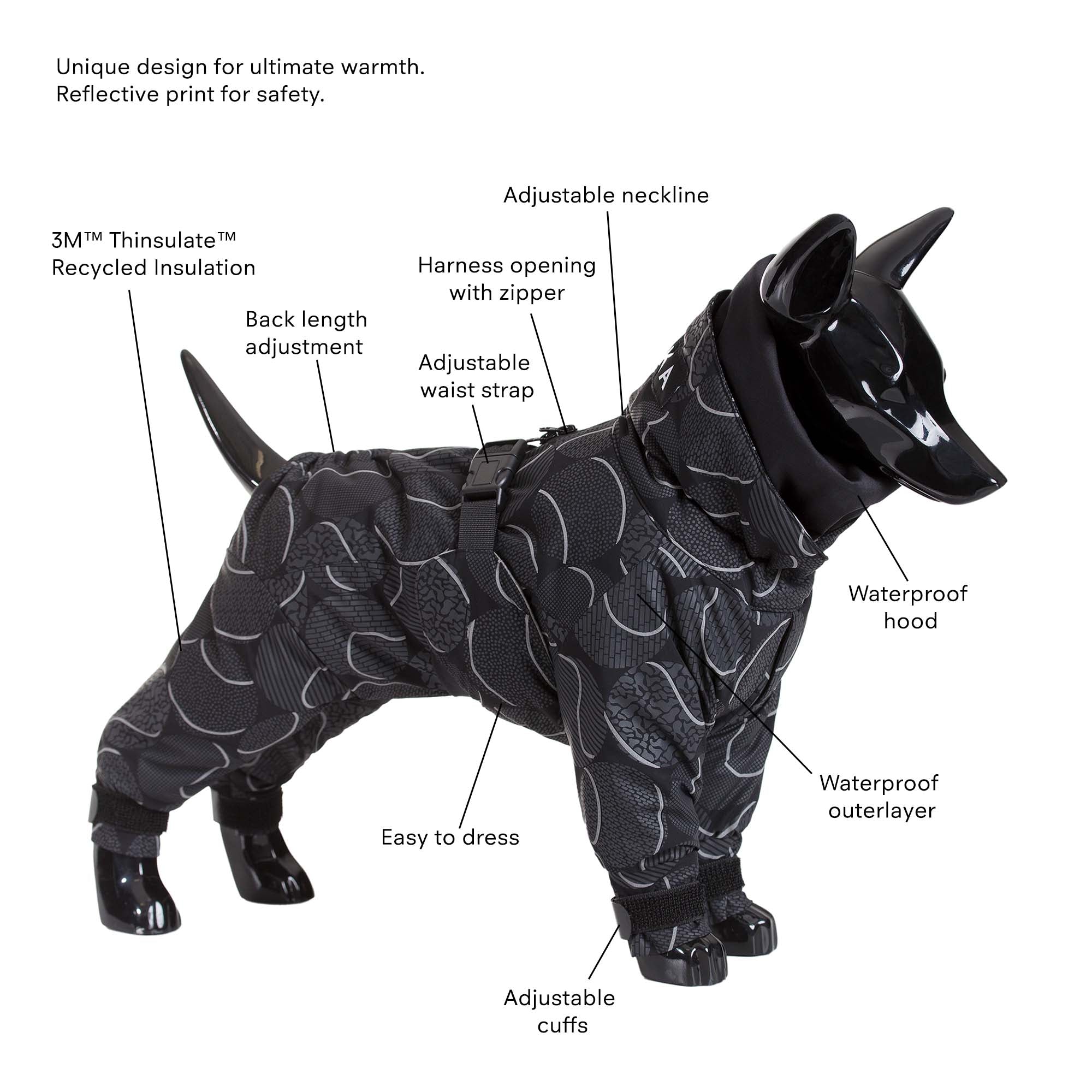 Heilgalli frá Paikka sem er vatnsheldur og hlýr. Gallinn er með endurskinsprentun fyrir aukið öryggi. Einstök hönnun tryggir að gallinn er þéttur en passar vel og er þægilegur fyrir hundinn.