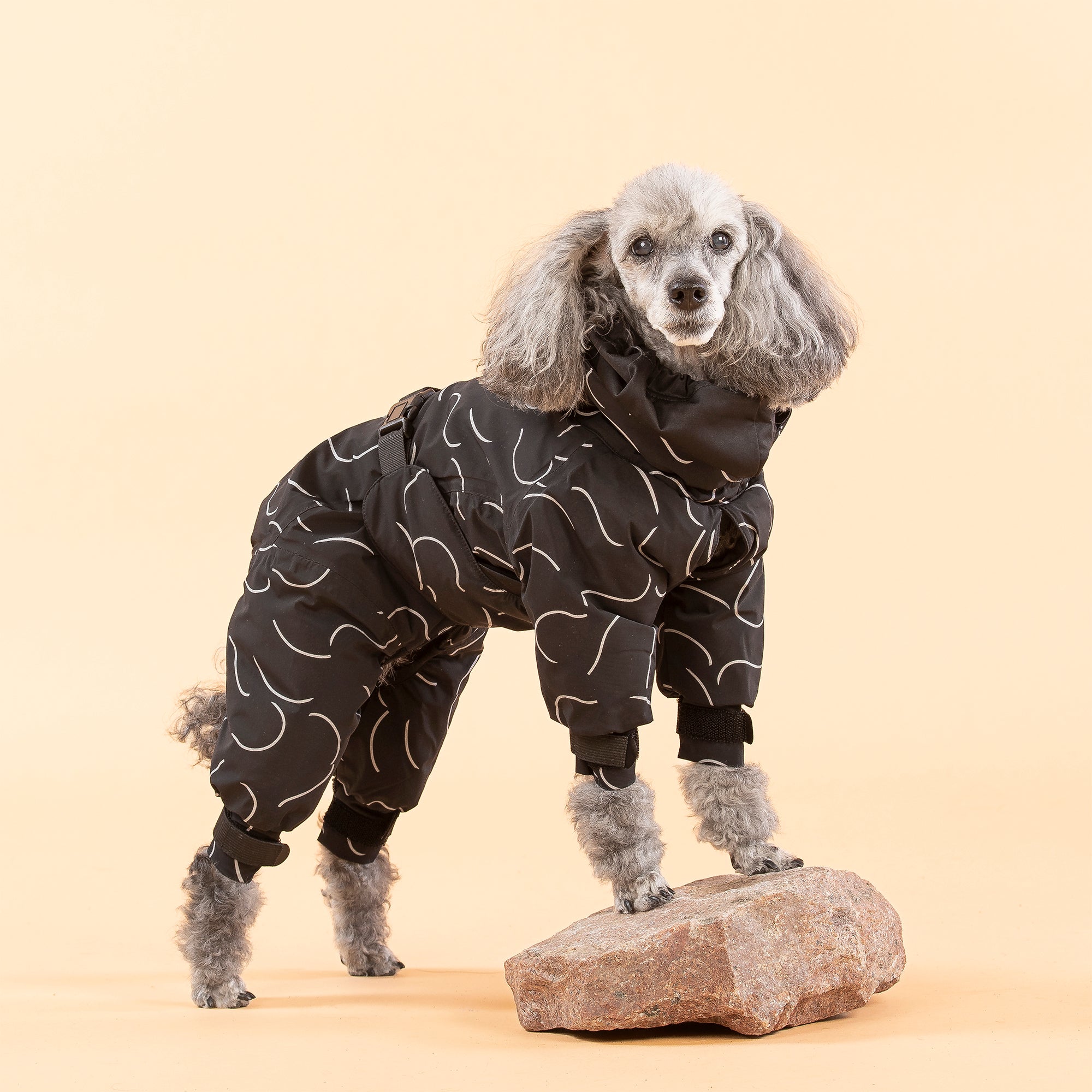 Hægt er að stilla hálsmálið, baklengd, mittisbandið og skálmar til að aðlaga sem best að hverjum hundi. Gallinn er einnig með rauf með rennilás til að hægt sé að festa taum í beisli.