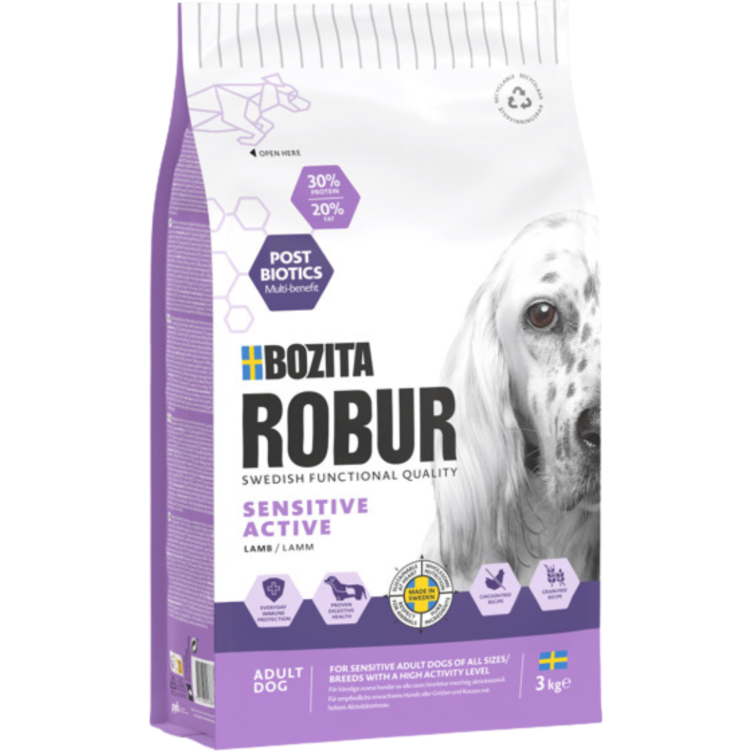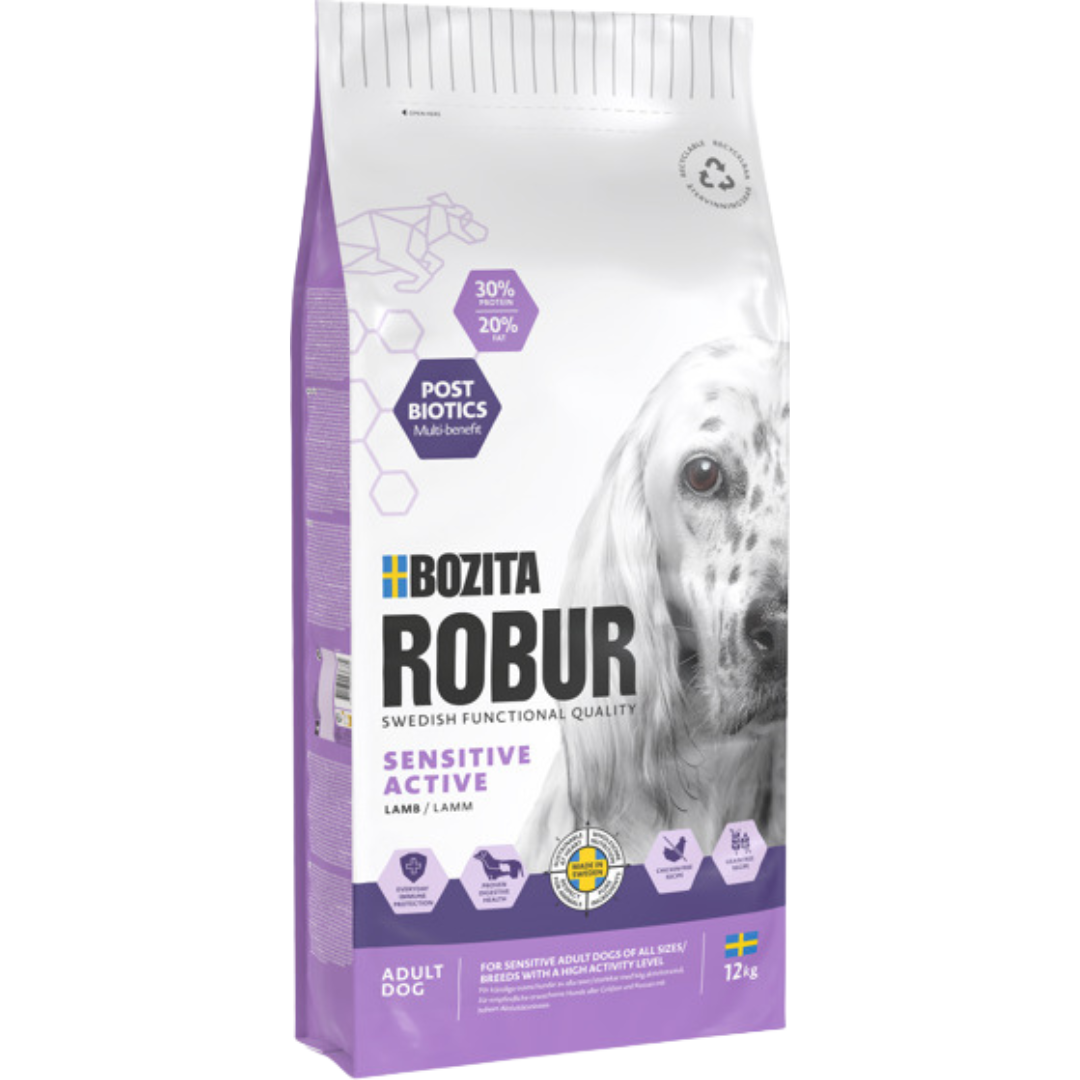 Bozita Robur korn- og kjúklingalaust þurrfóður með lambakjöti fyrir virka og viðkvæma fullorðna hunda.
