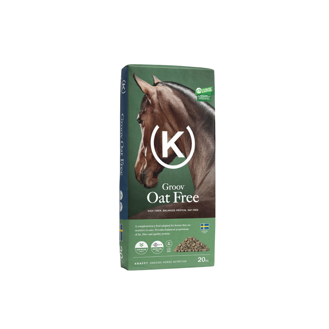 An oat-free feed specially adapted for the oat-sensitive horse. Groov Oat Free contains a balanced level of protein and ensures the intake of quality protein and fibre.