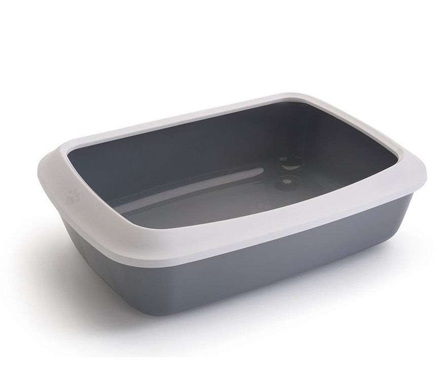 Klassískur kattasands kassi úr plasti með ramma. Ramminn kemur í veg fyrir að það fari mikill sandur út fyrir kassann.