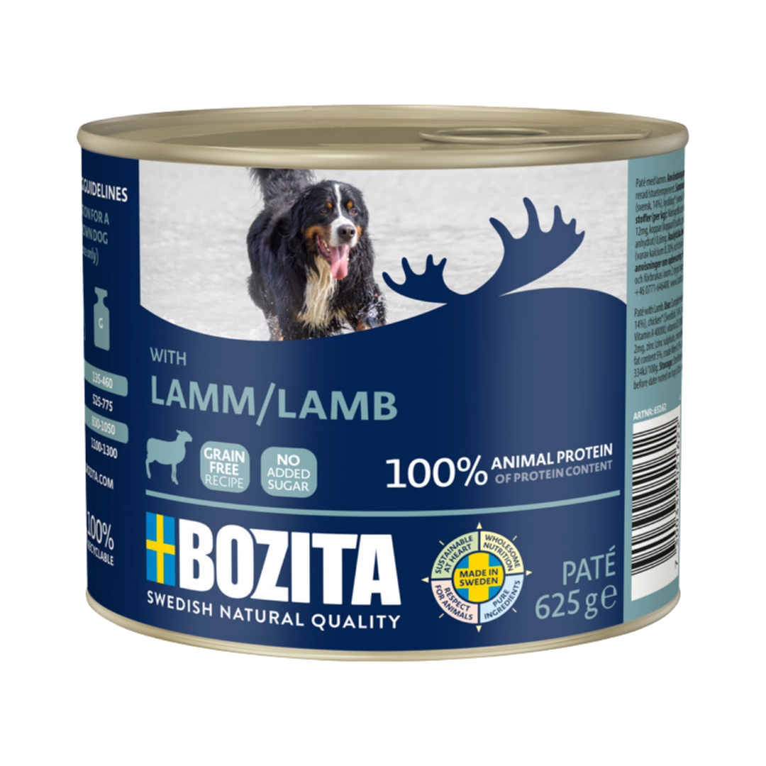 Bozita paté með lambakjöti er kornlaust blautfóður fyrir hunda sem má bera fram sem heila máltíð eða nota sem ábót yfir þurrfóður.