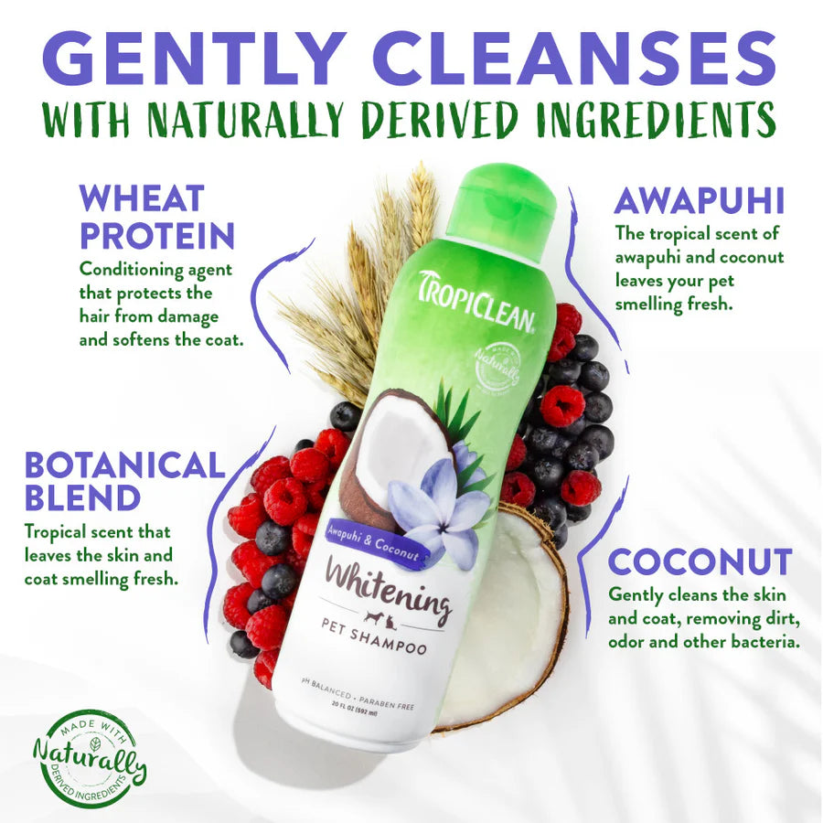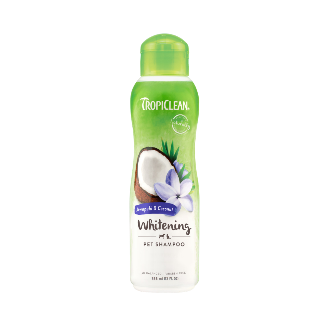 Láttu náttúrulegan glans feldsins njóta sín með TropiClean Awapuhi & Coconut Whitening sjampóinu fyrir hunda og ketti. Sjampóið hreinsar feldinn varlega, fjarlægir óhreinindi og hjálpar til við að gera feldinn bjartari og fallegri, sérstaklega hjá dýrum með hvítan eða ljósan feld.