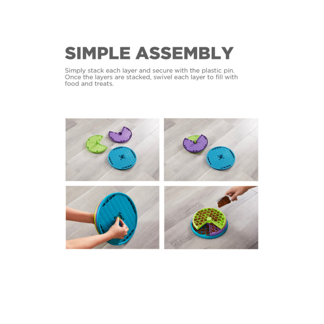 Hundar þurfa að rata í gegnum þrjú lög af fóður hólfum með því að snúa hverju lagi til að afhjúpa nammið/fóðrið