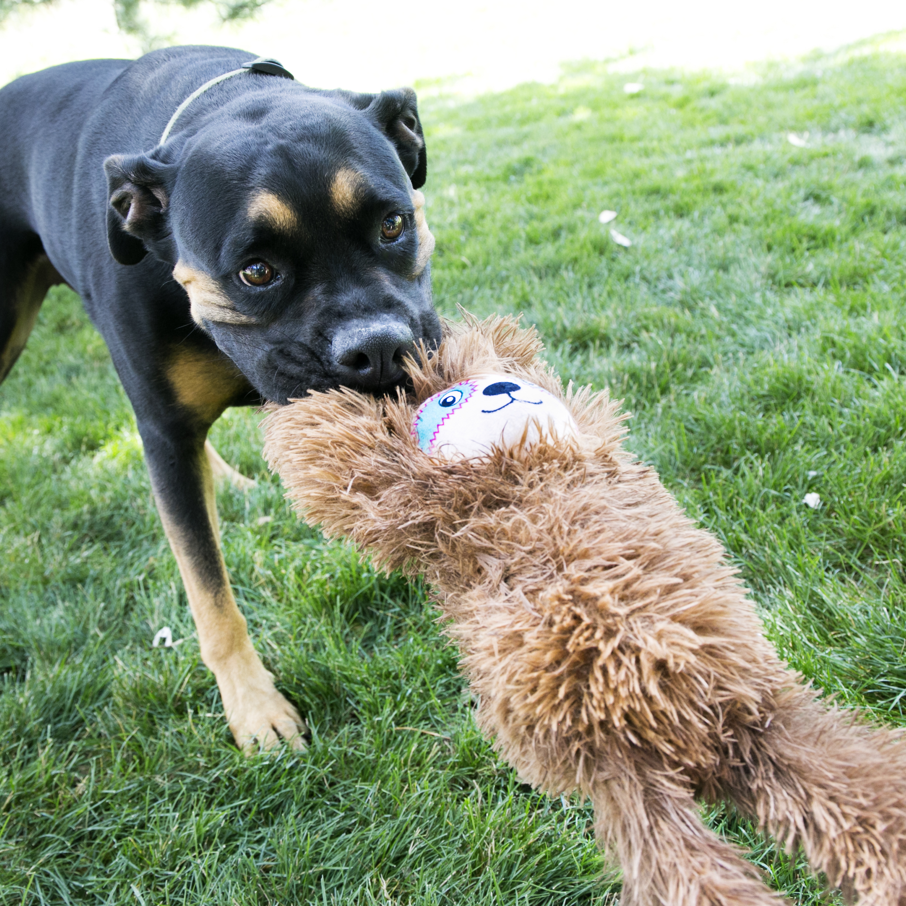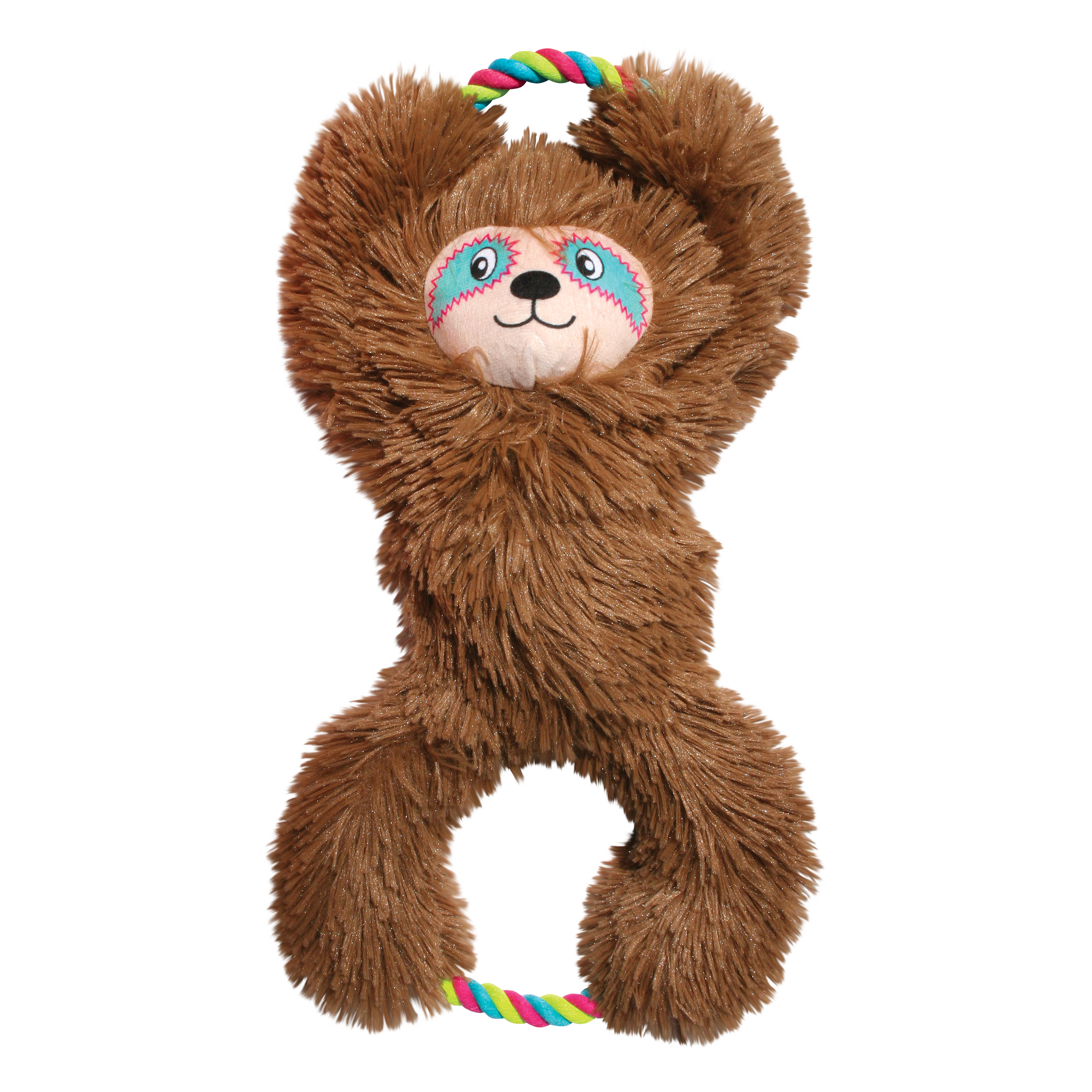 KONG Tuggz letidýr er í XL stærð, fullkomið fyrir langar leiki, bæði til að togast á og sækjaþ Langur bolurinn endar með reipi sem hentar vel til að hrista og slá um sig, auk þess að mæta náttúrulegri þörf hunda fyrir að naga. Mjúkur bolur, tvær ýlur og brakandi hendur vekja leikgleði og hvetja hundinn til að leika sér.